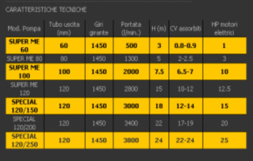 Mod. pompa Tubo uscita (mm) Giri girante Portata (l/min.) H (m)CV assorbiti