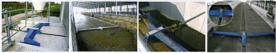 Raschiatori a Farfalla ad ali snodate, sono ideali per corsie senza paglia. Nel viaggio di ritorno questi raschiatori chiudono le “ali” verso il centro evitando problemi di mobilità agli animali.
