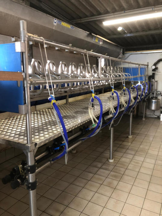 Impianto Mungitura per capre da 16 posti in linea composto da: Palchetto da 16 posti in acciaio inox Piano in alluminio antiscivolo Tramoggia per il mangime con sistema calibrato per la distribuzione precisa dell’alimento Lavaggio automatico ad alta efficienza 8 Gruppi mungitori cpl di collettore e valvole Aut. Terminale di raccolta da 45lt. con sanitario da 9lt filtro inox in linea Pulsazione elettronica Pompa vuoto ad anello di liqudo silenziosissima gestita da inverter per ottimizzare i consumi
